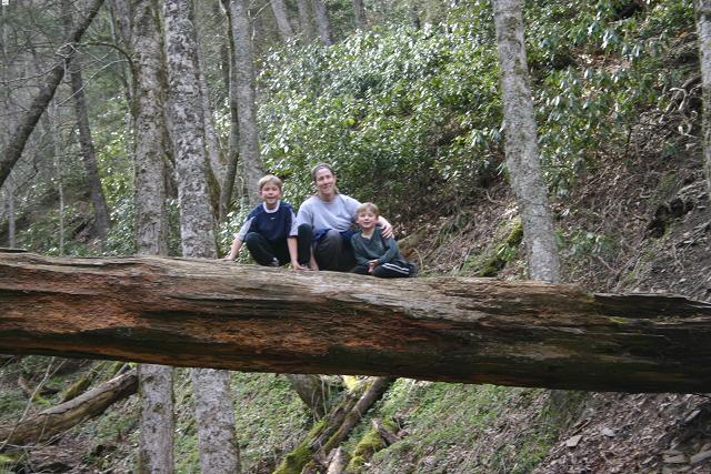 mom & boys on a log